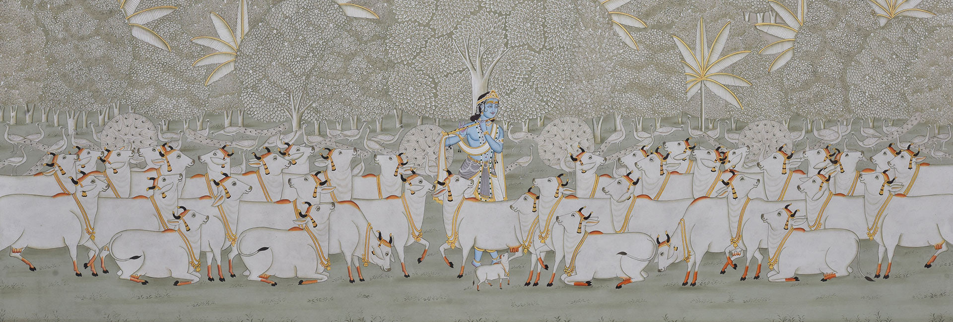 Pichwai (pichvai) is a style of painting that originated over 400 years ago, in the town of Nathdwara near Udaipur in Rajasthan, India. Intricate and visually stunning, pichwai paintings, made on cloth, depict tales from Lord Krishna’s life. Creating a pichwai can take several months, and requires immense skill, as the smallest details need to be painted with precision. Lord Krishna is often depicted as Shrinathji in Pichwais, which is the deity manifest as a seven-year-old child. Other common subjects found in pichwai paintings are Radha, gopis, cows and lotuses. Festivals and celebrations such as Sharad Purnima, Raas Leela, Annakoot or Govardhan Puja, Janmashtami, Gopashtami, Nand Mahotsav, Diwali and Holi are frequently depicted in Pichwais.